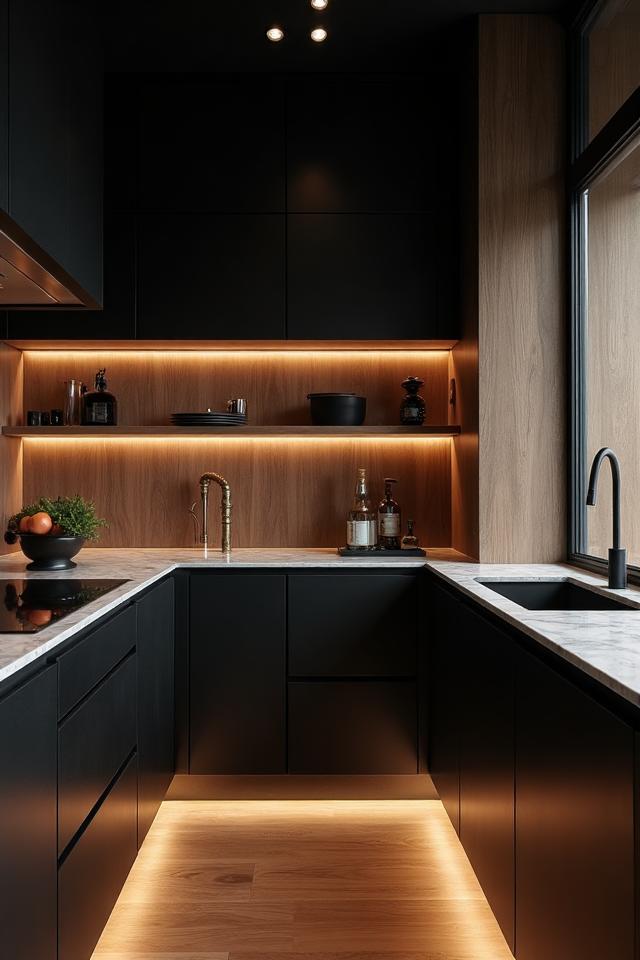 Líneas limpias, superficies sin tiradores y acabados mate en tonos oscuros.